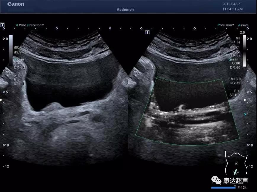 超声造影显示有明显的增强及消退的过程,肿瘤增强早于周边的膀胱壁,增强强度也显著高于周边膀胱壁。