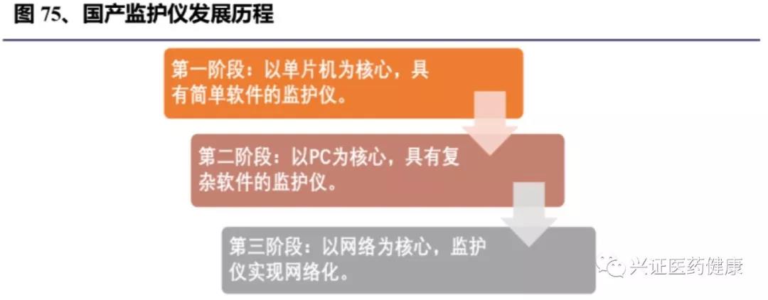 监护仪实现进口替代的过程和近二十年来电子技术、计算机技术、通信技术以及生物医学工程技术的发展分不开。从过去主要用于危重病人的监护,到目前普通病房的监护,从开始只用于麻醉、ICU、CCU、ER等科室,到目前已经扩展到神经内科、脑外科、骨科、呼吸科、妇产科、新生儿科等科室,从起初只有大医院配备,到目前县级乃至乡镇医疗机构大量使用,国产监护仪在其中发挥了重要作用。回顾国产监护仪的发展过程,起步较晚,大致可以分为三个阶段: