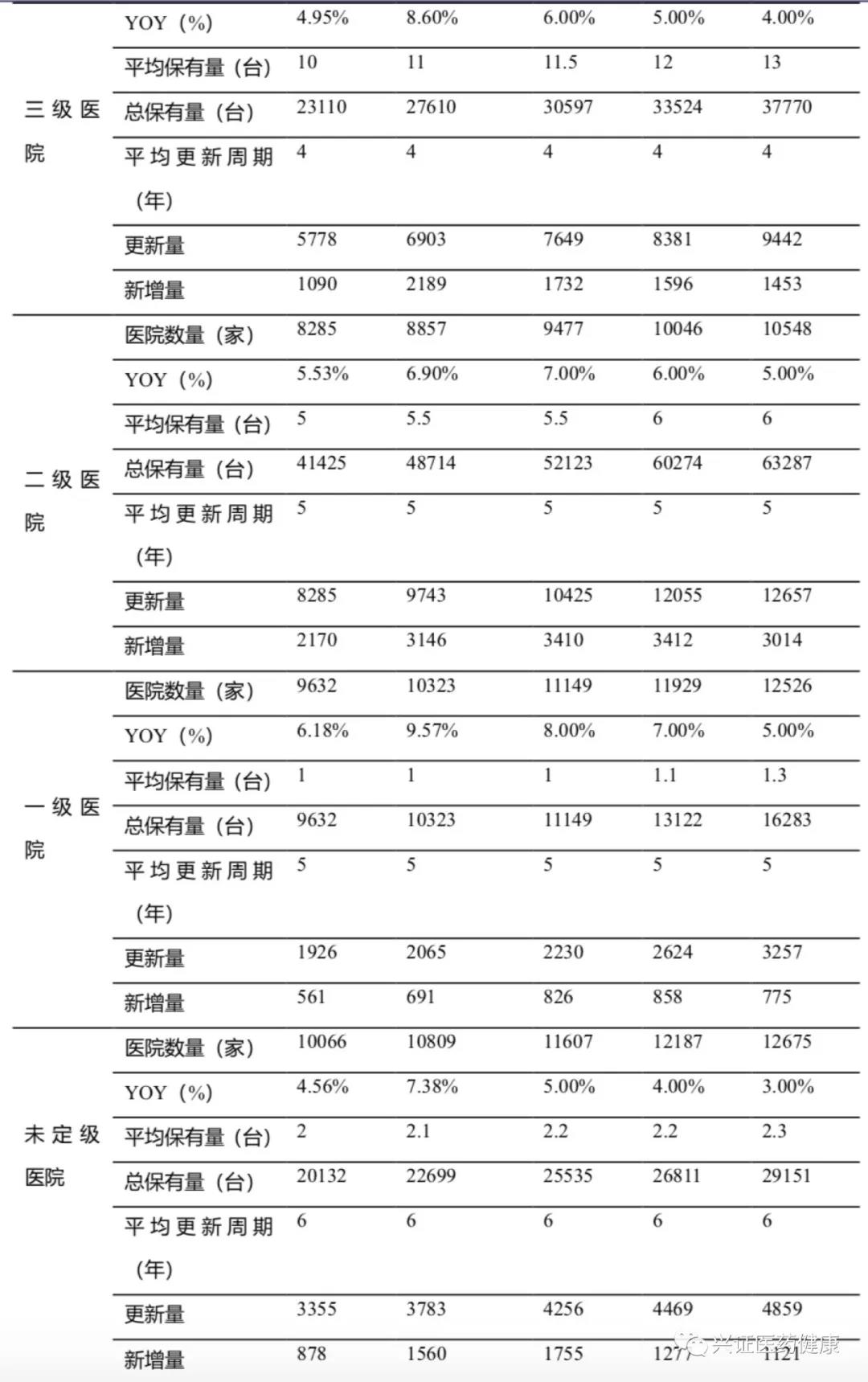 截至2017年底,各类卫生机构的彩超平均保有量不同。根据草根调研数据,三级医院平均可达10台,二级医院5台,一级医院1台,未定级医院2台(主要为民营医院),社区卫生机构0.5台,妇幼保健机构1台。未来国内彩超的需求新增主要来自三方面:一是现有彩超的更新替代,彩超平均更新周期为5年,对于使用频繁、损耗较快的三级医院不到5年就需要更换彩超设备;二是新建医疗卫生机构带来的增量需求;三是胸痛、卒中、创伤、危重孕产妇、危重新生儿等市级五大救治中心和县区分中心的建设,胸痛中心、危重孕产妇救治中心、危重新生儿救治中心和卒中中心均要求配置不少于1台彩超,其中胸痛中心自2017年开始建设,根据中国胸痛中心系统化建设项目规划,预计到2019年底,全国将建成超过1000家胸痛中心,预计最少新增1000台彩超,而2018年才开始建设的其余四大中心,预计将在3-5年全部完成建立,届时预计每年释放超过2000台的彩超需求。基于以上分析,我们对彩超国内市场空间进行测算如下: