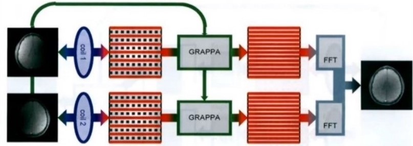 GRAPPA(generalized antocalibrating partially paralle acquisition)技术是在进行傅里叶转换之前,利用参考扫描得到的相控阵线圈敏感度信息来填充整个K空间,获得全FOV空间信息后,再利用傅里叶转换重建图像。(如图)